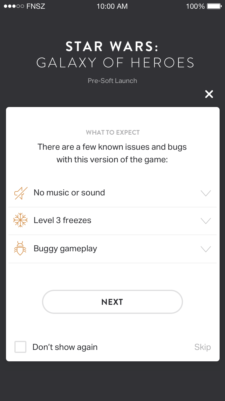 One of the most important screens was "What to Expect" - a transparent list of known issues before players even started. This served two purposes: