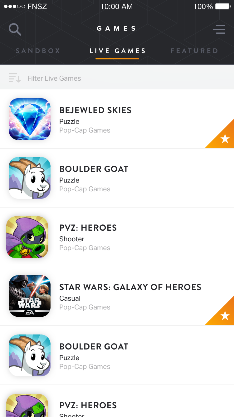 The Sandbox and Live Games tabs gave players a central place to discover testable games. Each game card clearly indicated its status (Pre-Soft Launch, Featured) and showed engaging key art. This visual-first approach helped players quickly identify games they wanted to test.
