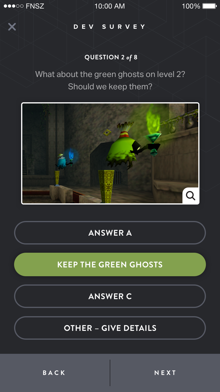 - Visual surveys using actual game assets to ask about difficulty or character design