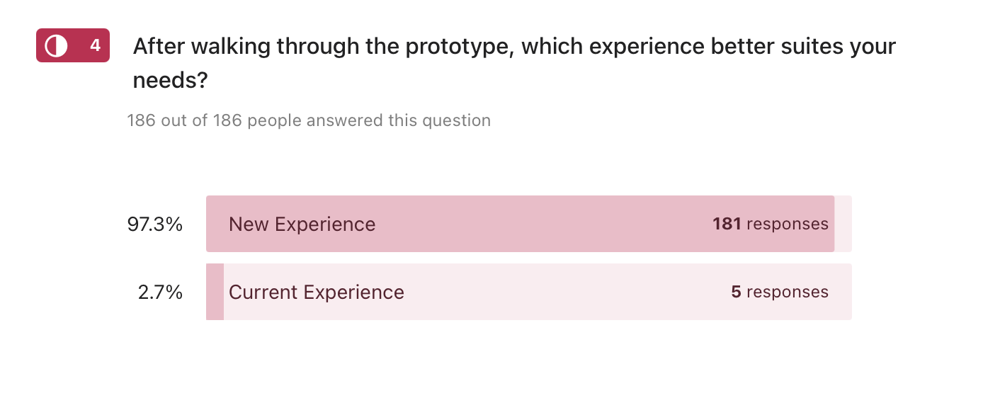 Out of 186 responses, 181 found our design prototypes to be a significantly better experience than the current candidate dashboard at the time (97.3%). This was a huge win for us and many respondents followed up with long form responses on what they liked best and least. Using a $7 Typeform account with Figma links was a huge win for us.