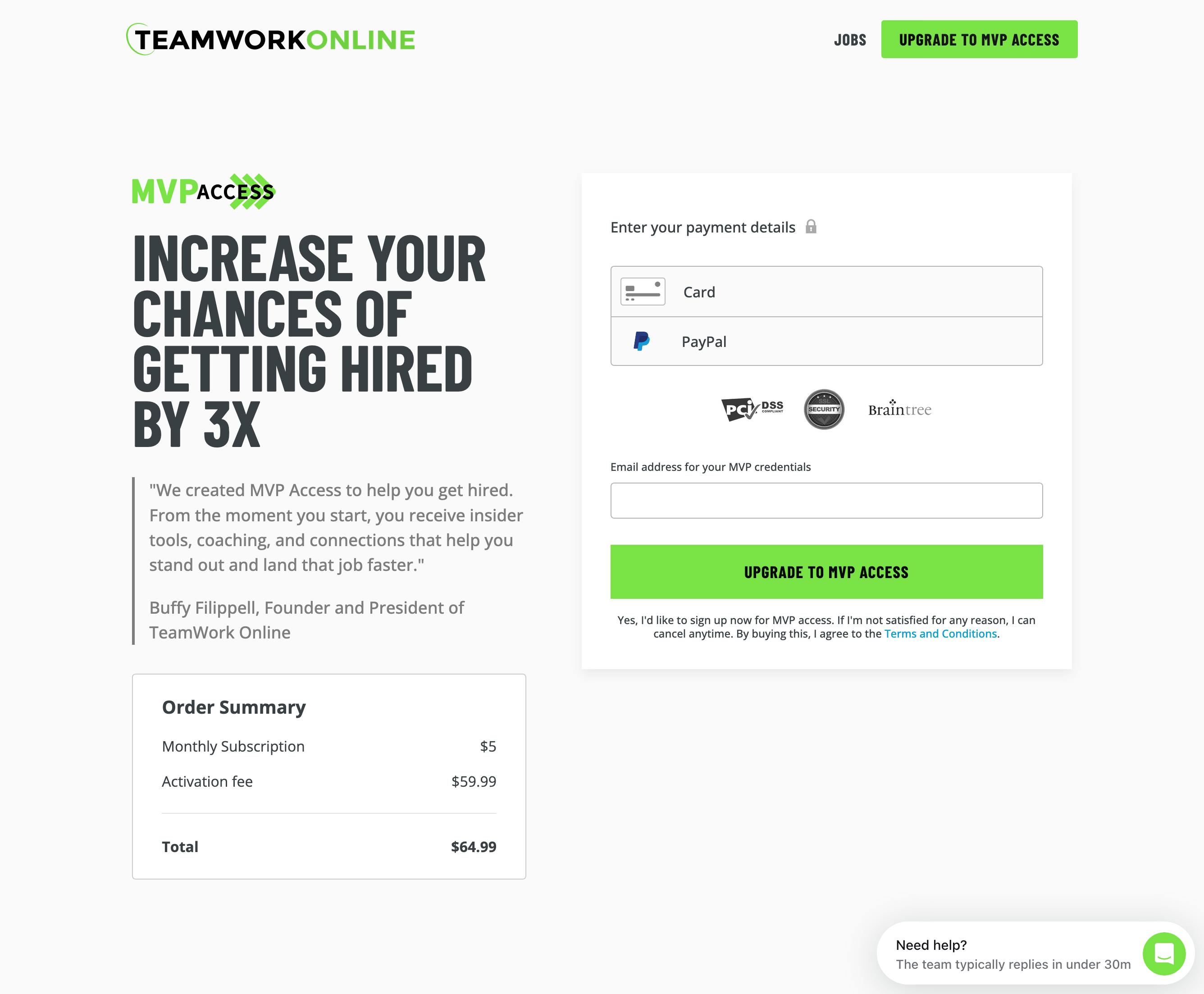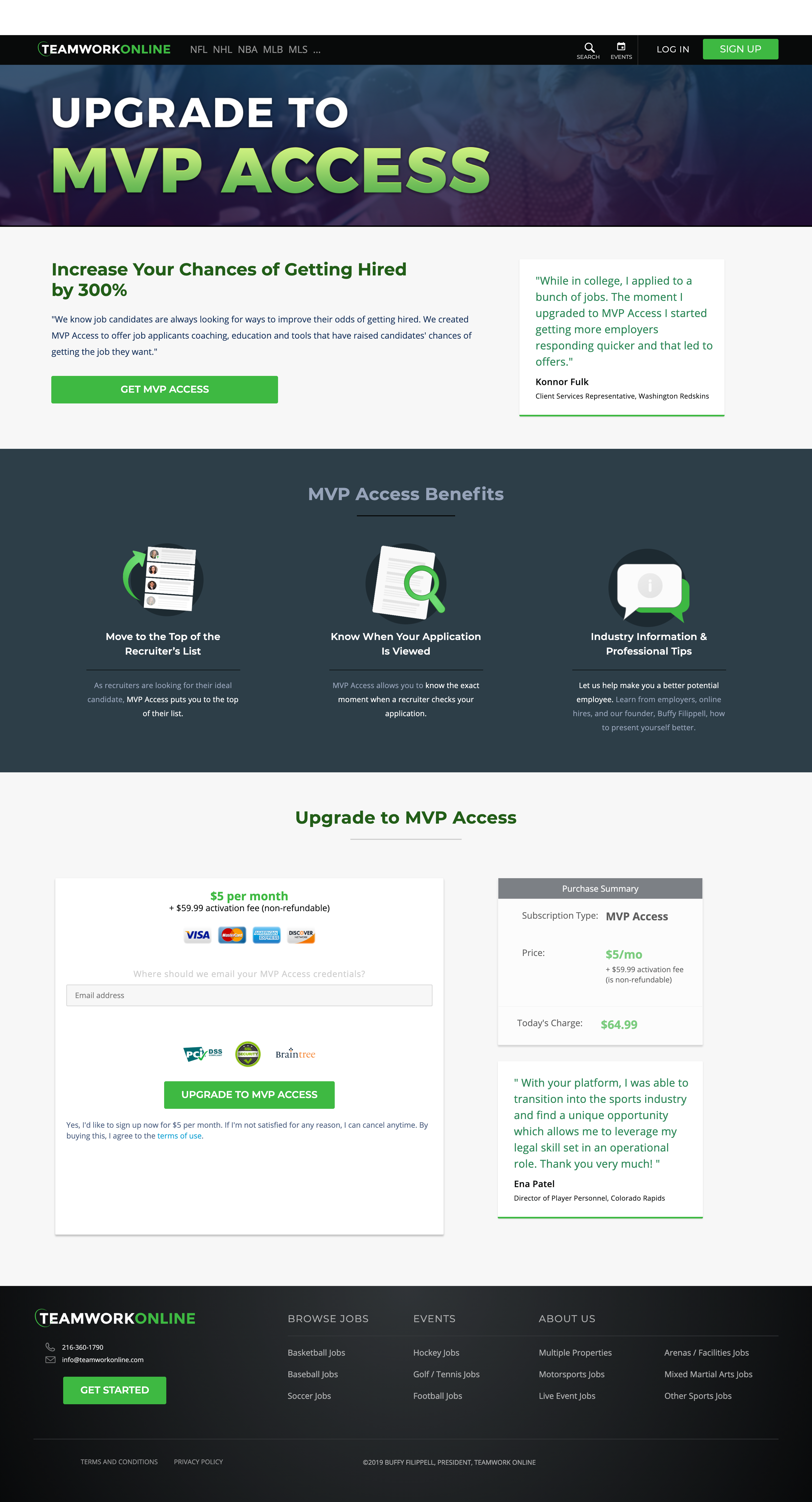 Teamwork Online's revenue generally comes from licensed partners (sports organizations that use TO job software) and job seekers who want access to premium features by way of the MVP subscription model. The old MVP marketing page was not converting well mostly due to poor layout and distracting elements.
